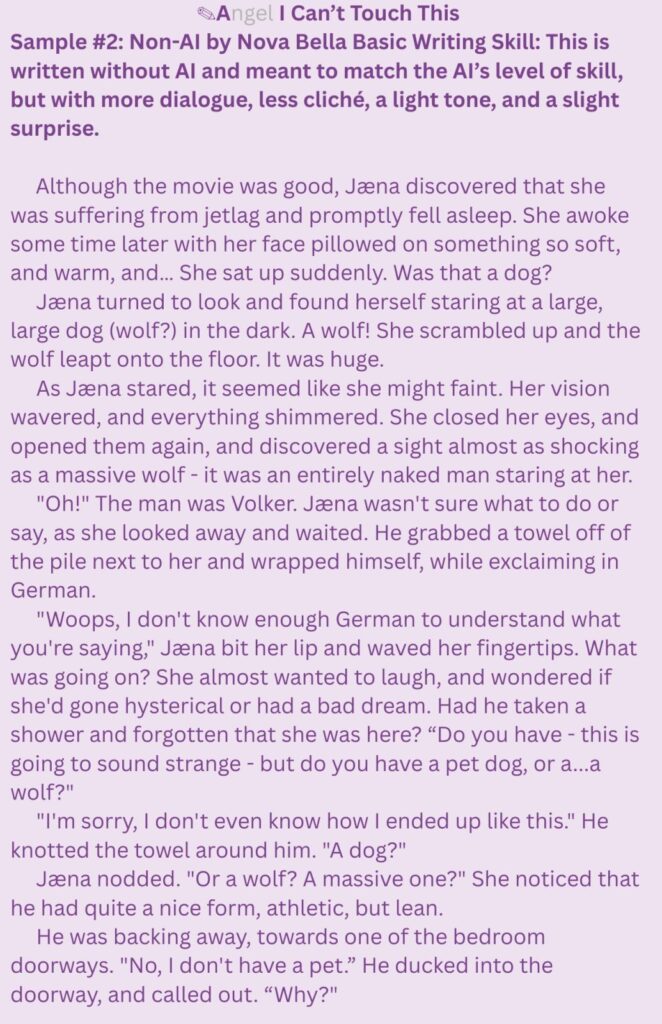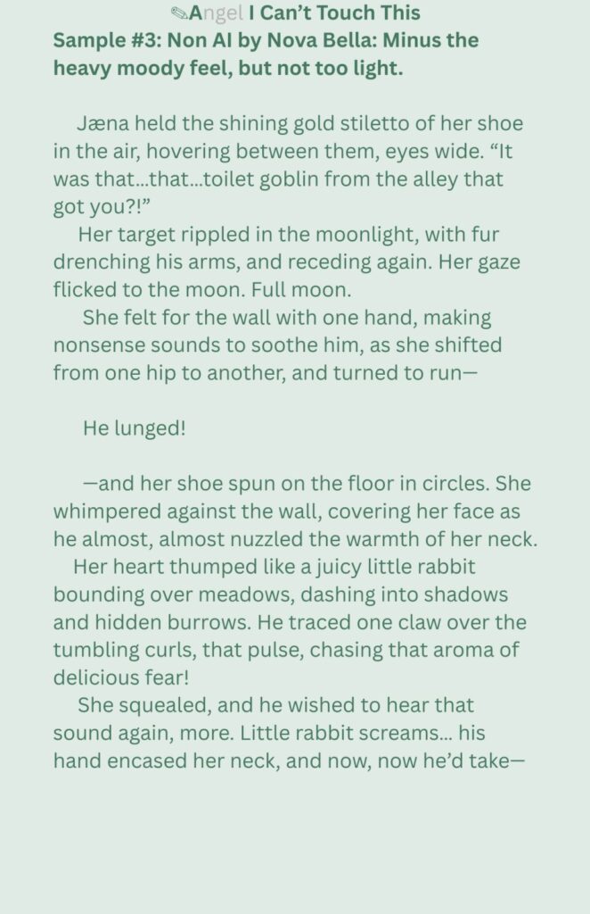 ✎𓂃Sample #1: Non AI by Nova Bella: Similar to the style of some of the AI samples. Past the pale gold of the pine floor, and the flat panes of leaded windows, buffeted by wind, a storm muffled the skies in thunder, and rivulets of dark water poured from the eaves. Jæna waited, and waited, checking the time on her silent wristwatch, and slowly, struggling to stay awake in the cozy warmth, she drifted. Potted ferns tapped the windows. Was that a feathered kiss, on her neck? She opened her eyes to a…a— Wolf? She froze in the heat of its thunder, as the magnificent danger rolled over her face and neck – its canines so close to tearing her… Jæna slowly closed her eyes, willing the beast to go away, and retreated not one breath, not a decimal, in her rabbity fright, clutching the table as… Dear G-d, she thought– And it was gone. She opened her eyes again to–not a golden-eyed wolf–but Volker, naked, before her. · “Oh!” Jæna spun around on her chair, still ready to run, and falling off the chair, as Volker awkwardly tried to catch her and also grab a white dish towel to cover himself. He managed both and apologized profusely in German, then English, while backing out of the room with a boyish blush. Jæna stared after him, dismayed with herself, or him, and his… pet (?), she wasn’t sure. She laughed once, a crazy bark that echoed, and found herself scanning the room for a weapon. What was that? Delusions? “Do you have a dog? Or a wolf? A big dog here?” she asked. ✎𓂃Sample #2: Non-AI by Nova Bella Basic Writing Skill: This is written without AI and meant to match the AI’s level of skill, but with more dialogue, less cliché, a light tone, and a slight surprise. Although the movie was good, Jæna discovered that she was suffering from jetlag and promptly fell asleep. She awoke some time later with her face pillowed on something so soft, and warm, and… She sat up suddenly. Was that a dog? Jæna turned to look and found herself staring at a large, large dog (wolf?) in the dark. A wolf! She scrambled up and the wolf leapt onto the floor. It was huge. As Jæna stared, it seemed like she might faint. Her vision wavered, and everything shimmered. She closed her eyes, and opened them again, and discovered a sight almost as shocking as a massive wolf – it was an entirely naked man staring at her. “Oh!” The man was Volker. Jæna wasn’t sure what to do or say, as she looked away and waited. He grabbed a towel off of the pile next to her and wrapped himself, while exclaiming in German. “Woops, I don’t know enough German to understand what you’re saying,” Jæna bit her lip and waved her fingertips. What was going on? She almost wanted to laugh, and wondered if she’d gone hysterical or had a bad dream. Had he taken a shower and forgotten that she was here? “Do you have – this is going to sound strange – but do you have a pet dog, or a…a wolf?” “I’m sorry, I don’t even know how I ended up like this.” He knotted the towel around him. “A dog?” Jæna nodded. “Or a wolf? A massive one?” She noticed that he had quite a nice form, athletic, but lean. He was backing away, towards one of the bedroom doorways. “No, I don’t have a pet.” He ducked into the doorway, and called out. “Why?” ✎𓂃Sample #3: Non AI by Nova Bella: Minus the heavy moody feel, but not too light. Jæna held the shining gold stiletto of her shoe in the air, hovering between them, eyes wide. “It was that…that…toilet goblin from the alley that got you🙹” Her target rippled in the moonlight, with fur drenching his arms, and receding again. Her gaze flicked to the moon. Full moon. She felt for the wall with one hand, making nonsense sounds to soothe him, as she shifted from one hip to another, and turned to run— He lunged! —and her shoe spun on the floor in circles. She whimpered against the wall, covering her face as he almost, almost nuzzled the warmth of her neck. Her heart thumped like a juicy little rabbit bounding over meadows, dashing into shadows and hidden burrows. He traced one claw over the tumbling curls, that pulse, chasing that aroma of delicious fear! She squealed, and he wished to hear that sound again, more. Little rabbit screams… his hand encased her neck, and now, now he’d take— |