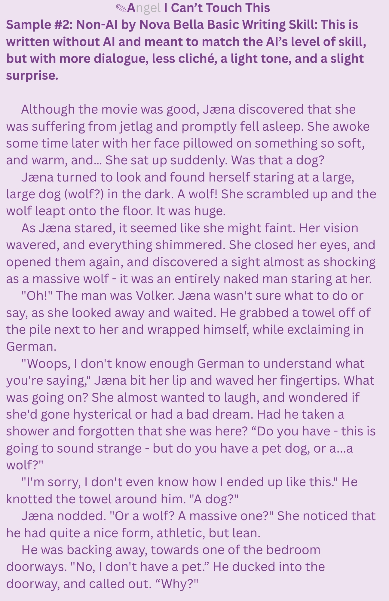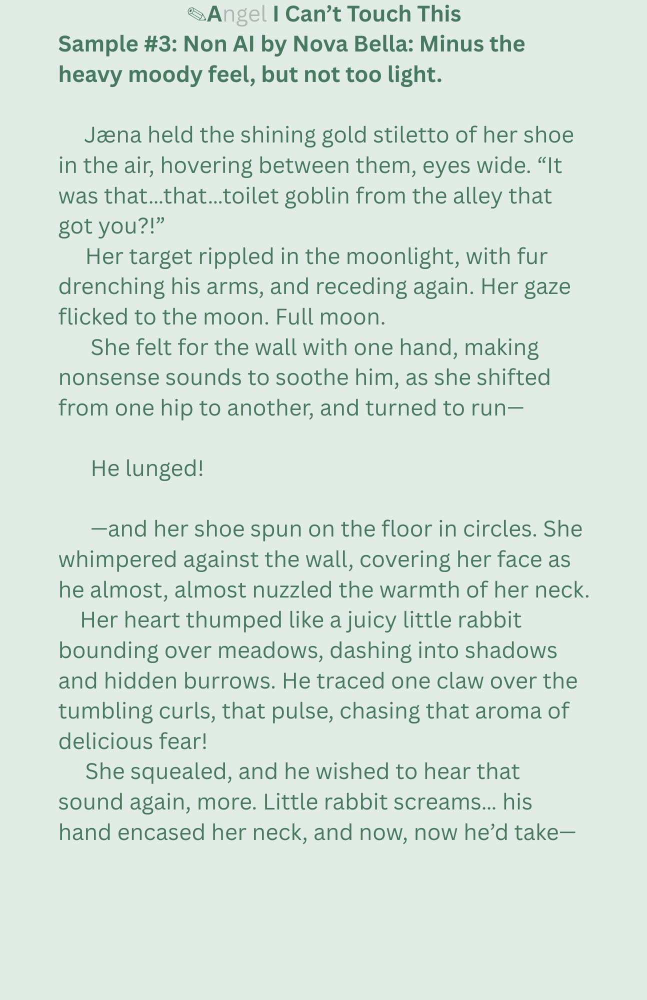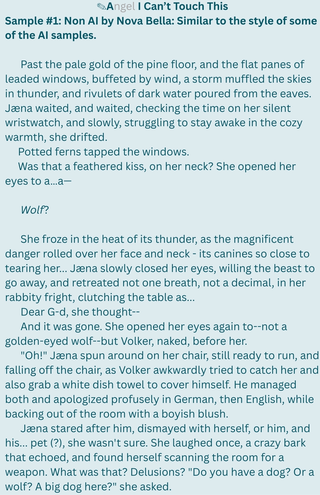✎𓂃Sample #1: Non AI by Nova Bella: Similar to the style of some of the AI samples. Past the pale gold of the pine floor, and the flat panes of leaded windows, buffeted by wind, a storm muffled the skies in thunder, and rivulets of dark water poured from the eaves. Jæna waited, and waited, checking the time on her silent wristwatch, and slowly, struggling to stay awake in the cozy warmth, she drifted. Potted ferns tapped the windows. Was that a feathered kiss, on her neck? She opened her eyes to a…a— Wolf? She froze in the heat of its thunder, as the magnificent danger rolled over her face and neck – its canines so close to tearing her… Jæna slowly closed her eyes, willing the beast to go away, and retreated not one breath, not a decimal, in her rabbity fright, clutching the table as… Dear G-d, she thought– And it was gone. She opened her eyes again to–not a golden-eyed wolf–but Volker, naked, before her. · “Oh!” Jæna spun around on her chair, still ready to run, and falling off the chair, as Volker awkwardly tried to catch her and also grab a white dish towel to cover himself. He managed both and apologized profusely in German, then English, while backing out of the room with a boyish blush. Jæna stared after him, dismayed with herself, or him, and his… pet (?), she wasn’t sure. She laughed once, a crazy bark that echoed, and found herself scanning the room for a weapon. What was that? Delusions? “Do you have a dog? Or a wolf? A big dog here?” she asked. ✎𓂃Sample #2: Non-AI by Nova Bella Basic Writing Skill: This is written without AI and meant to match the AI’s level of skill, but with more dialogue, less cliché, a light tone, and a slight surprise. Although the movie was good, Jæna discovered that she was suffering from jetlag and promptly fell asleep. She awoke some time later with her face pillowed on something so soft, and warm, and… She sat up suddenly. Was that a dog? Jæna turned to look and found herself staring at a large, large dog (wolf?) in the dark. A wolf! She scrambled up and the wolf leapt onto the floor. It was huge. As Jæna stared, it seemed like she might faint. Her vision wavered, and everything shimmered. She closed her eyes, and opened them again, and discovered a sight almost as shocking as a massive wolf – it was an entirely naked man staring at her. “Oh!” The man was Volker. Jæna wasn’t sure what to do or say, as she looked away and waited. He grabbed a towel off of the pile next to her and wrapped himself, while exclaiming in German. “Woops, I don’t know enough German to understand what you’re saying,” Jæna bit her lip and waved her fingertips. What was going on? She almost wanted to laugh, and wondered if she’d gone hysterical or had a bad dream. Had he taken a shower and forgotten that she was here? “Do you have – this is going to sound strange – but do you have a pet dog, or a…a wolf?” “I’m sorry, I don’t even know how I ended up like this.” He knotted the towel around him. “A dog?” Jæna nodded. “Or a wolf? A massive one?” She noticed that he had quite a nice form, athletic, but lean. He was backing away, towards one of the bedroom doorways. “No, I don’t have a pet.” He ducked into the doorway, and called out. “Why?” ✎𓂃Sample #3: Non AI by Nova Bella: Minus the heavy moody feel, but not too light. Jæna held the shining gold stiletto of her shoe in the air, hovering between them, eyes wide. “It was that…that…toilet goblin from the alley that got you🙹” Her target rippled in the moonlight, with fur drenching his arms, and receding again. Her gaze flicked to the moon. Full moon. She felt for the wall with one hand, making nonsense sounds to soothe him, as she shifted from one hip to another, and turned to run— He lunged! —and her shoe spun on the floor in circles. She whimpered against the wall, covering her face as he almost, almost nuzzled the warmth of her neck. Her heart thumped like a juicy little rabbit bounding over meadows, dashing into shadows and hidden burrows. He traced one claw over the tumbling curls, that pulse, chasing that aroma of delicious fear! She squealed, and he wished to hear that sound again, more. Little rabbit screams… his hand encased her neck, and now, now he’d take— |